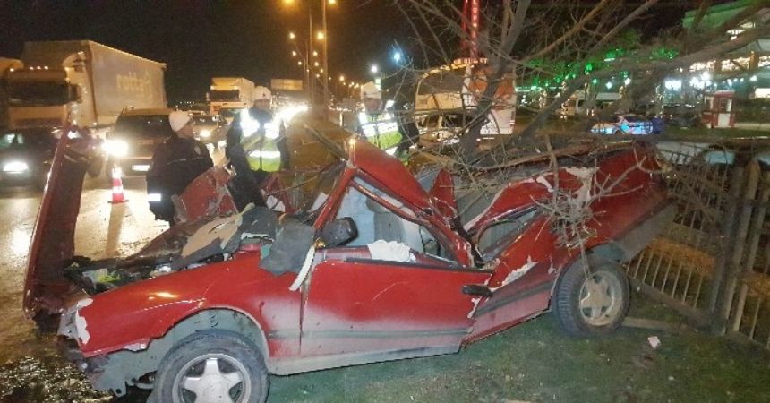 Samsun’da yoldan çıkarak orta refüjdeki demir bariyer ile ağaca çarpıp parçalanan otomobilde bulunan 3 kişi kazayı yaralı olarak atlattı.