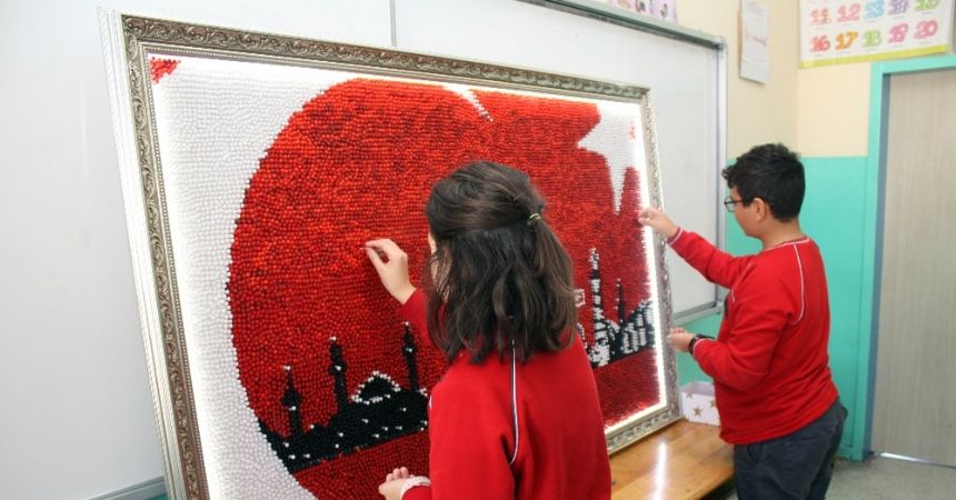 Tokat’ta kent merkezinde bulunan 26 Haziran Ortaokulundan Türkçe Öğretmeni Mevlüt Taşkın ve Sınıf Öğretmeni Bahadır Koç, 6-C sınıfı öğrencileriyle birlikte 20 bin harita çivisi kullanarak Türk bayrağı yaptı. Üzerinde Tokat Kalesi, Tokat Saat Kulesi, Hıdırlık Köprüsü ve Ali Paşa Camii siluetlerinin de bulunduğu 1 metreye 1 buçuk metre ebadındaki Türk bayrağının yapımının 20 gün sürdüğünü söyleyen Türkçe Öğretmeni Mevlüt Taşkın, projeye diğer sınıflardaki öğrencilerin de 1’er çivi ile katkı sağladıklarını söyledi. Projede esas amaçlarının öğrencilere vatan, bayrak ve memleket sevgisini aşılamak olduğunu söyleyen Taşkın, "20 ila 25 günlük bir sürecin ürünü bu proje. Toplamda 20 bin tane mantar pano çivisi kullandık ve bunların temini çok zor oldu. Çünkü kutu olarak aldığımızda bizim için oldukça maliyetliydi. Bunları doğrudan toptancısından temin ederek işe başladık. Çocuklarımız teneffüslerde, okul çıkışlarında, öğle aralarında severek, koşarak bu işi yapmaya yöneldiler. Değerlerimiz, geleceğimizdir diyerek başladığımız bu çalışmada; dayanışmayı, sabretmeyi ve en önemlisi vatan sevgisi, memleket sevgisi ve bayrak sevgisini aşılamak gibi bir amaç edindik. Ben hepsinin eline emeğine sağlık diyorum" dedi.
