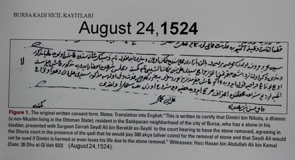 Belgeleri günümüz Türkçe’sine tercüme eden Yrd. Doç. Dr. Faruk Tonga, "En eski belgeye 1524 yılına ait Bursa kadı sicili kayıtlarında rastladık. Bulabildiğimiz en erken kaydın olduğu bu belgede Bursa’da Balıkpazarı Mahallesi’nde Nikola oğlu Dimitri isimli gayrimüslim Osmanlı vatandaşı o bölgede cerrah olarak çalışan Seydi Ali bin Bereket isimli cerrahın yaptığı mesanesinde taş olduğu teşhisi sonrası iki şahit huzurunda mahkemeye başvuruyor. 300 akçe karşılığında bu ameliyat için anlaştığını ve ameliyat sonrası hastalık ilerlerse, daha kötü olursa veya ölürse akrabalarının davacı olmayacağını ayrıca kamu davası açılmamasını beyan ediyor" dedi.