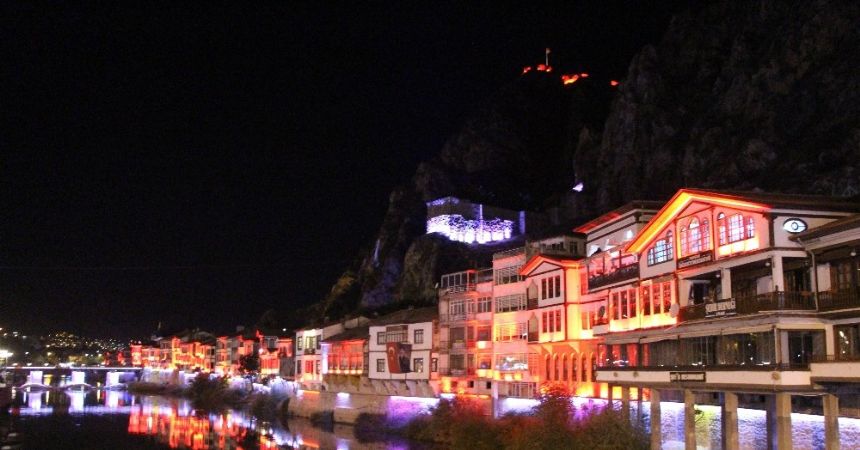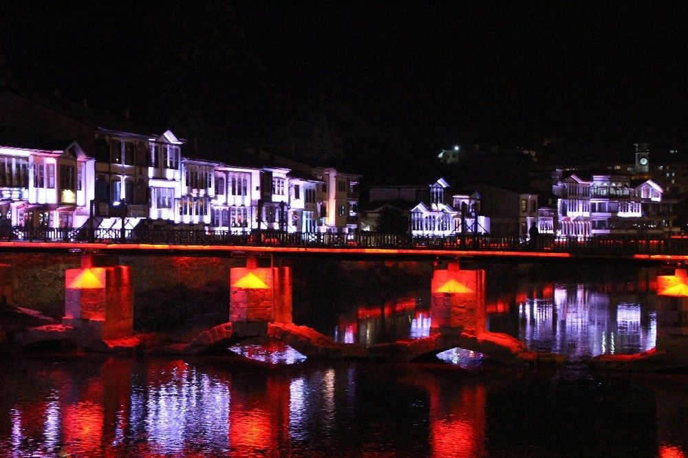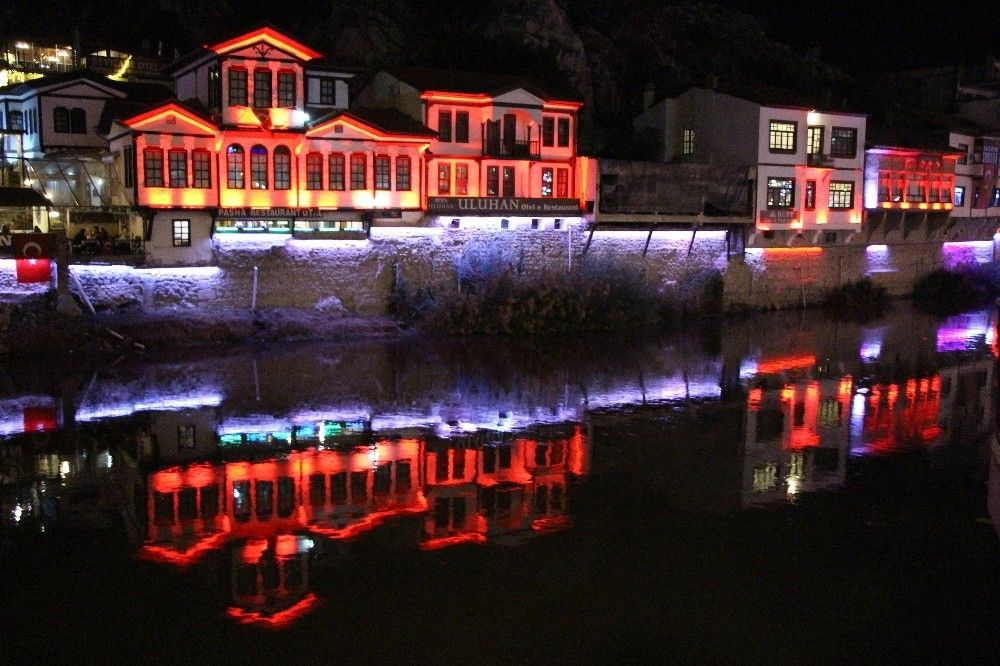 Hafta başından bu yana al bayrağın rengini alan Yeşilırmak’ın kıyısındaki Osmanlı döneminden kalma konaklar, Harşena Dağı, yamacındaki kale, kral kaya mezarları ve köprüler görsel şölene davetiye çıkardı. Evlerin görüntüsü Yeşiırmak’a yansırken birçok kişi o anları takip edip fotoğraf çektirdi.