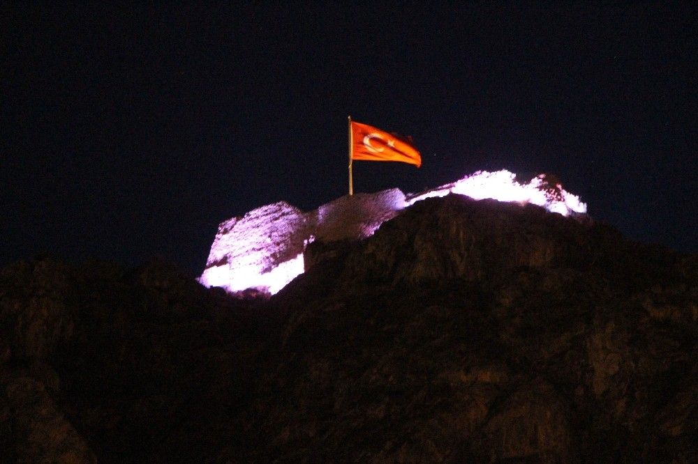 Amasya’daki tarihi Harşena Dağı ve eteğindeki Yalıboyu Evleri 29 Ekim Cumhuriyet Bayramı dolayısıyla şanlı Türk bayrağının renkleri olan kırmızı-beyaza büründü