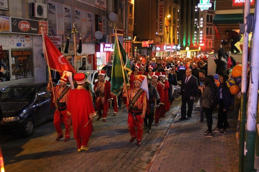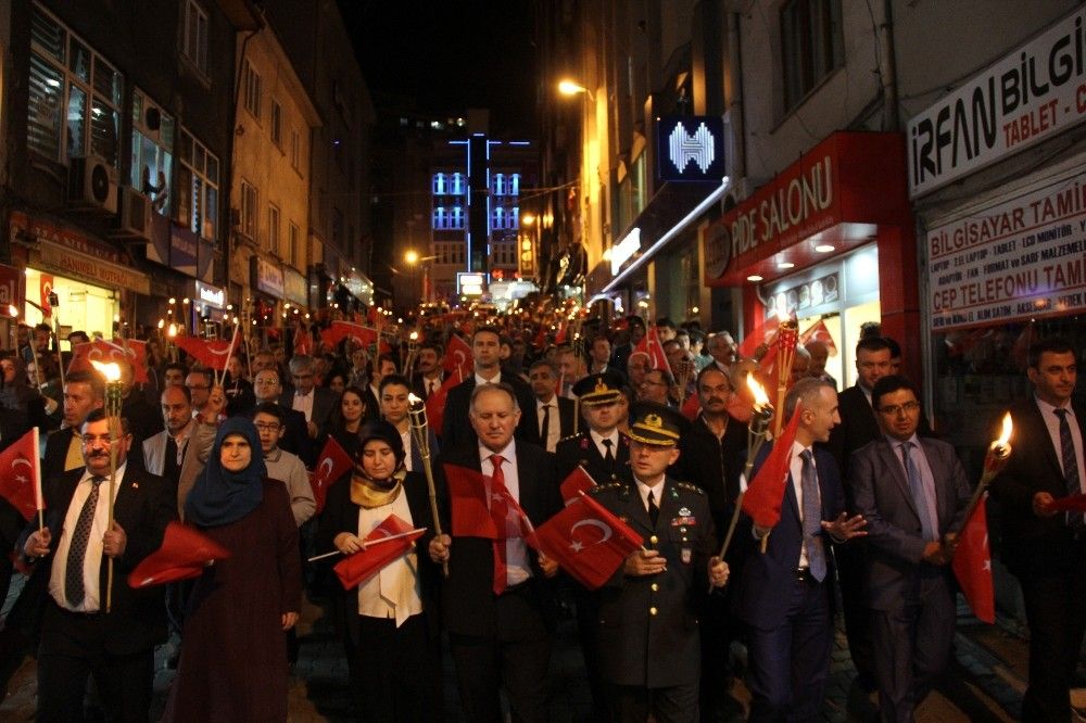 Artvin’de Türkiye Cumhuriyeti’nin kuruluşunun 94. yıl dönümü kutlamaları kapsamında mehter marşları eşliğinde meşalelerle fener alayı yürüyüşü düzenlendi.