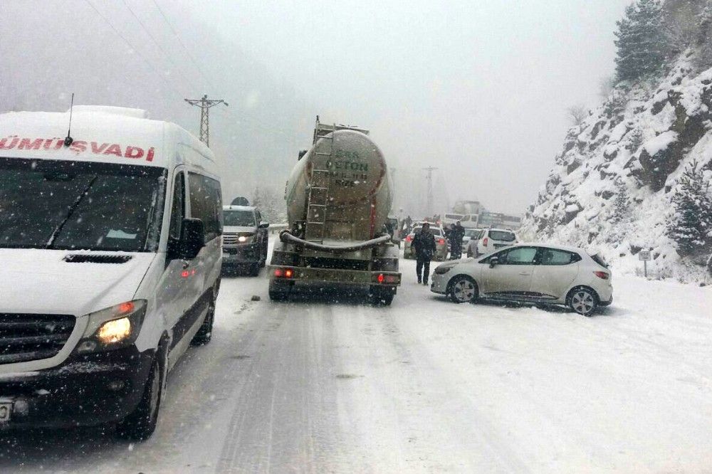 Doğu Karadeniz’i Doğu Anadolu’ya bağlayan en önemli geçitlerden Zigana Dağı geçidinde kar yağışı ulaşımı olumsuz etkiliyor. Dünden beri bölgede etkili olan yağışın bugün sabah saatlerinden itibaren etkisini artırmasıyla Gümüşhane-Trabzon karayolunda ulaşımda aksamalar meydana gelmeye başladı. Yağış ve soğuk hava nedeniyle buzlanmanın da meydana geldiği geçitte TIR’lar kayganlaşan yolda yan dönerken, bazı kış lastiği kullanmayan araçlar da yoldan çıktı. Yetkililer 15 ile 30 santimetre arası kar kalınlığının bulunduğu geçidi kullanacak sürücülerin dikkatli ve tedbirli olmalarını, yanlarında mutlaka çekme halatı, takoz ve zincir bulundurmalarını istedi.