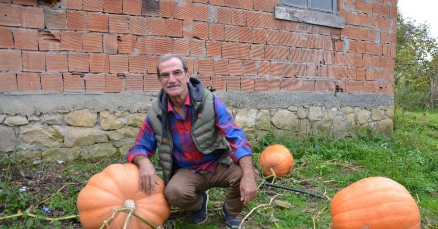 Ordu’nun Ünye ilçesinde emekli bir vatandaş bahçesinde yaklaşık 50 kiloluk kabaklar yetiştirdi