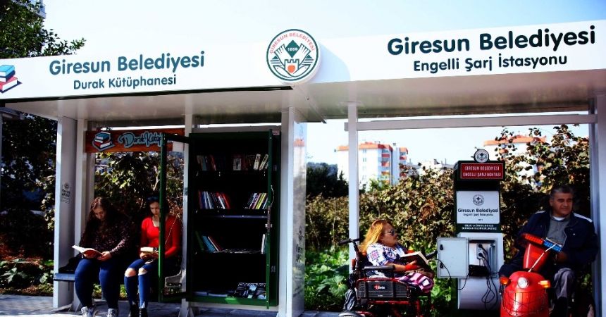 Giresun Beleyesi tarafından yapılan ‘Durak kütüphane ve engeli şarj istasyonu’ hizmete girdi. Türkiye’de ilk olarak ‘Kütüphane Bank’ın açılmasının ardından Giresun Üniversitesi Güre yerleşkesi yolu üzerine kurulan ‘Durak kütüphane ve engelli şarj istasyonu’ hem öğrencileri hem de engellileri sevindirdi.