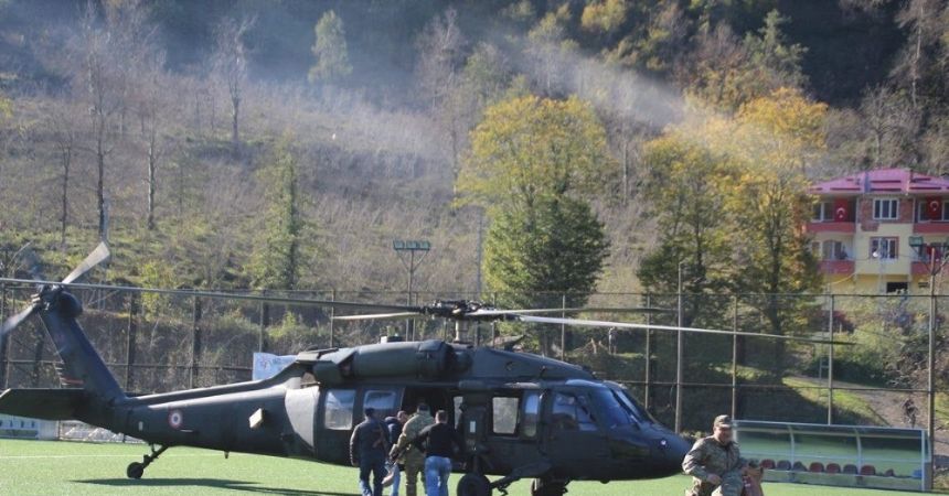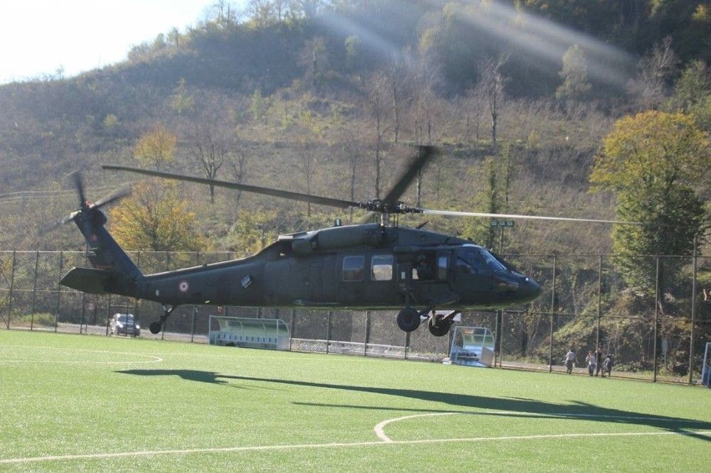 Dün Yağlıdere ilçesinde 1. Amatör Küme’de mücadele eden Yağlıderespor ve Doğankentsporlu futbolcular maç öncesi hazırlık yaptığı sırada ilçe stadına inen helikoptere binen rütbeli komutanlar bölgeyi havadan inceledi.
