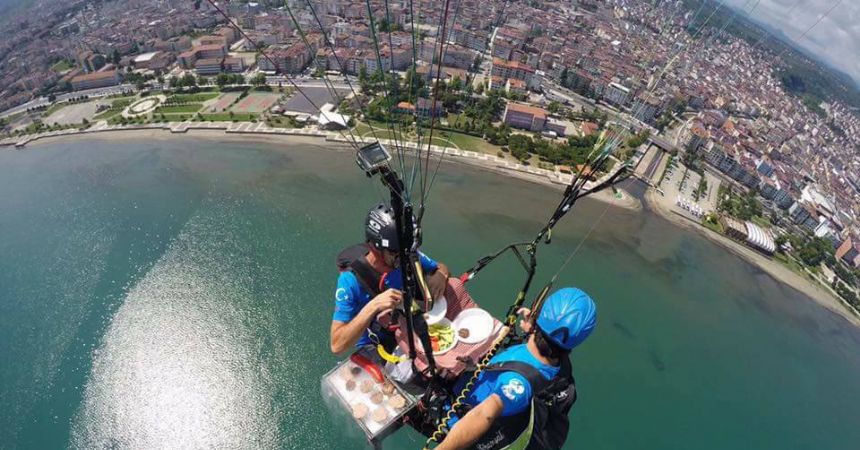 Ordu’da yamaç paraşütü yapan iki çılgın genç, havada mangal yapıp yemek yedi.