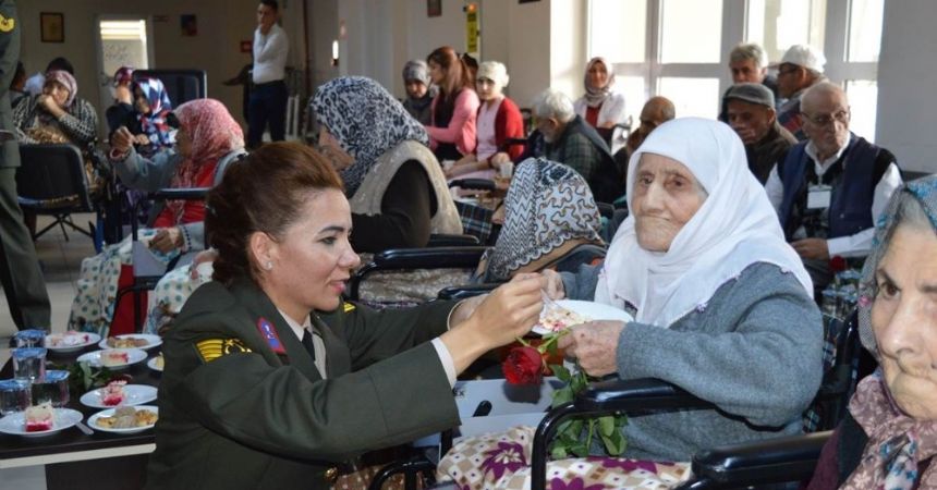 Amasya Valisi Dr. Osman Varol’un eşi Funda Varol ile İl Jandarma Komutanı Albay Selami Akşit’in eşi Gülden Akşit’in öncülük ettiği ziyarette çiçeklerin dağıtılmasının ardından kesilen pastalardan yaşlı kadının kendi başına yemekte güçlük çektiğini fark eden Astsubay Kıdemli Üstçavuş Nuray Yeşilkaya hemen harekete geçti. Tabak ve çatalı eline alan Yeşilkaya, tıpkı annesine yedirir gibi pastayı yedirdi.