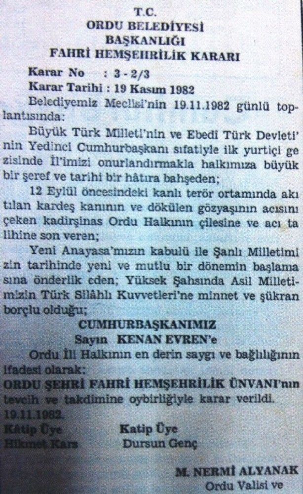 Dönemin hem Ordu Valisi hem de Belediye Başkanı olan Nermi Alyanak, Belediye Meclisini toplayarak Kenan Evren’i “fahri hemşehri” ilan etti. Bu karar 19 Kasım 1982 günü resmiyete döküldü.