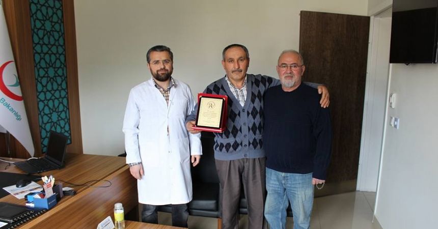 Reşadiye Devlet Hastanesi Başhekim Vekili ve Op. Dr. Turhan Dokumacıoğlu ve Dr. Tamer Özdemir cihaz için Dursun Yaşar Çakır’a teşekkür plaketi takdim etti.