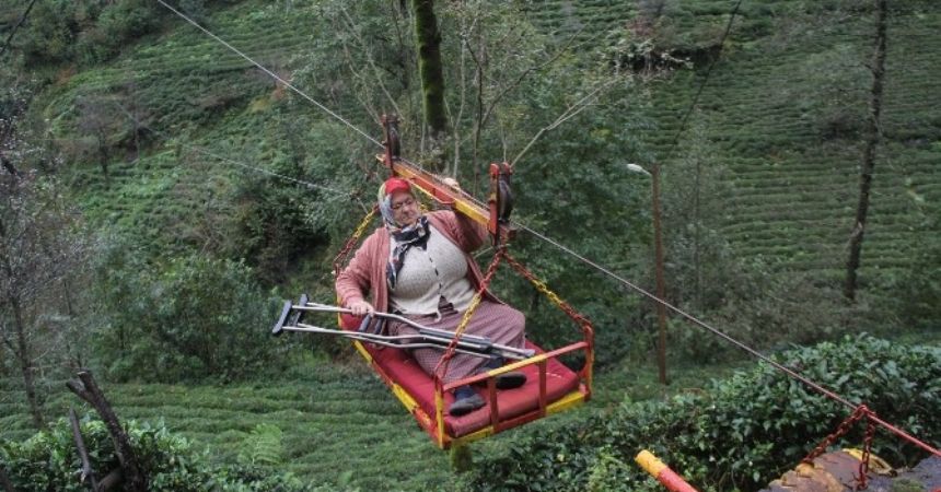 Rize’de kuma olan iki yaşlı kadın, geçirdikleri rahatsızlıklardan dolayı yolu olmayan evlerine ulaşmak için ölümü göze alarak 70 metre derinlikteki vadiyi ilkel teleferikle geçiyorlar.