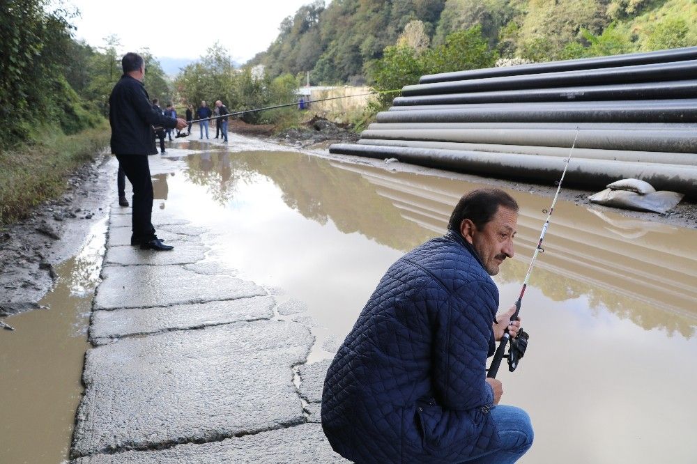 Rize merkeze bağlı 11 ayrı köyü birbirine bağlayan grup yolunda kapatılmayan çukurlar suyla dolunca köy sakinleri yoldaki çukurlarda birikmiş suya olta atarak yollarının yapılmamasını protesto ettiler.