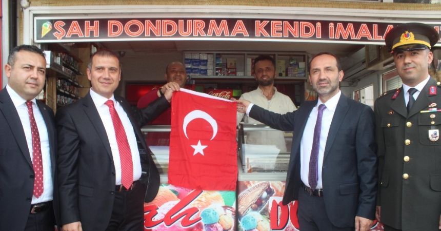İş yeri sahipleri bayrak dağıtımından dolayı Kaymakam ve beraberindekilere teşekkür ederek onlarla hatıra fotoğrafı çektirdi.