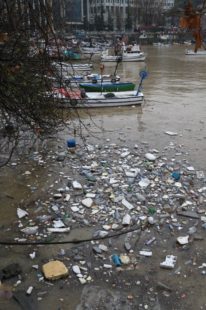Zonguldak kent merkezinde dün akşamdan bu yana aralıklarla etkili olan yağmurun getirdiği çöp yığınları limana ulaştı. Olumsuz hava koşulları sebebiyle teknelerini limana bağlayan balıkçı esnafı dereye çöp atan vatandaşlara tepki gösterdi. Yağmurla birlikte sahil sarıya boyandı. Çamurla birlikte deniz suyunun rengi değişti.