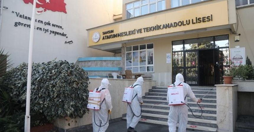Milli Eğitim Bakanlığı, 31 Ağustos’ta başlattığı uzaktan eğitim sürecinin ardından mesleki ve teknik Anadolu liseleri ile çok programlı anadolu liselerinde 5 Ekim’den itibaren uygulamalı dersler için yüz yüze eğitime geçilmesini kararlaştırdı. Bu kararın ardından Atakum Belediyesi, tüm Türkiye ile birlikte öğrenciler için kentte ilk ders zilinin çalacağı mesleki ve teknik anadolu liselerinin yanı sıra çok programlı liselerde dezenfeksiyon işlemi gerçekleştirdi. Atakumlu gençleri, koronavirüs salgınına karşı korumak için ilk ders günü öncesinde hafta sonu mesaisi yapan Atakum Belediyesi’nin hijyen timleri, sabahın erken saatlerinde belediyenin Fen İşleri Şantiyesi’nde bir araya geldi. Koruyucu kıyafetlerini giyip özel ekipmanlarını yanlarına alan hijyen timleri, araçlarla ilçenin farklı bölgelerindeki okullara ulaştı.