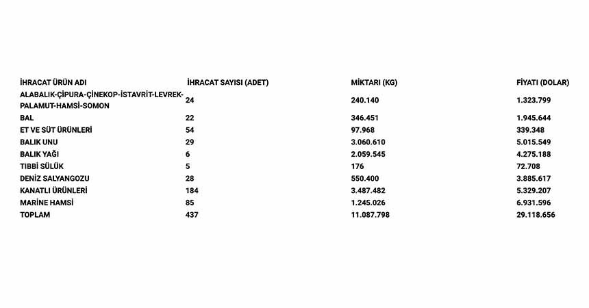 En fazla hareketliliğin su ürünlerinde olduğunu belirten Kırmacı, "2018 yılındaki hayvansal kökenli ürün ihracatımızda en büyük pay su ürünleri sektöründe gerçekleşmiştir; Su ürünleri ihracatı da kendi içinde Balık Unu, Balık Yağı ve Marine Hamsi sıralamasıyla gerçekleşmiştir. Bu alandaki ihracatımızı sırasıyla Kanatlı Ürünleri Bal ve Et- Süt ürünleri ihracatımız takip etmektedir" dedi.