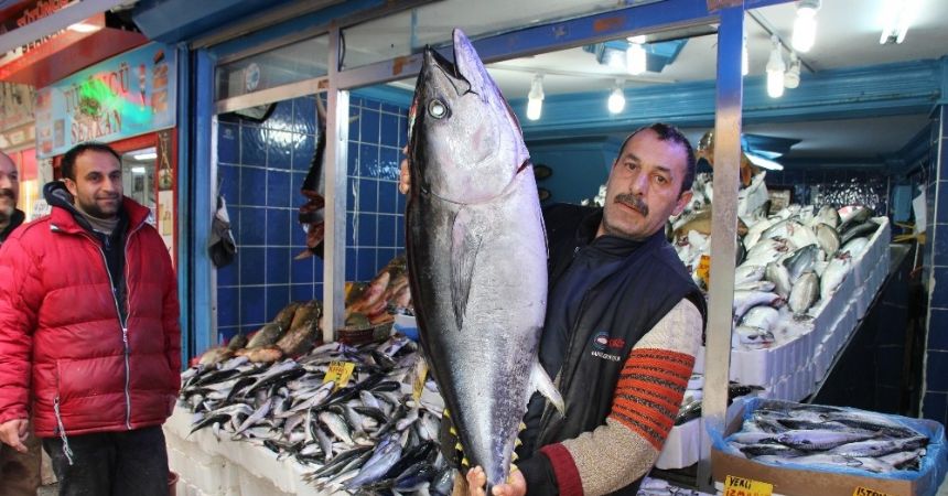 Boyları 1 metreyi geçen orkinoslar Samsun’da balıkçı tezgahlarını şenlendirdi.