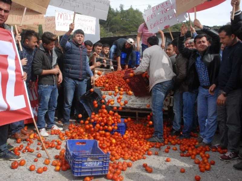 Muğla’nın Seydikemer ilçesinde 50-60 kuruşa sattıkları domatesin pazarda 3, markette 6 TL’den satılmasına tepki gösteren üreticiler, kasalar dolusu domatesi yola döktü. Yaklaşık 1 kilometre yürüyüş yapıp, Seydikemer-Antalya karayolunu kapatan üreticiler "Her şeyi biz yapıyoruz, tüm emekleri biz harcıyoruz, aracılar kazanıyor. Tepkimiz aracılara. Hükümetten turizme verilen teşviklerin köylüye de vermesi, kapanan Rusya ihracatının dışında yeni pazarlar bulmasını istiyoruz" dedi.