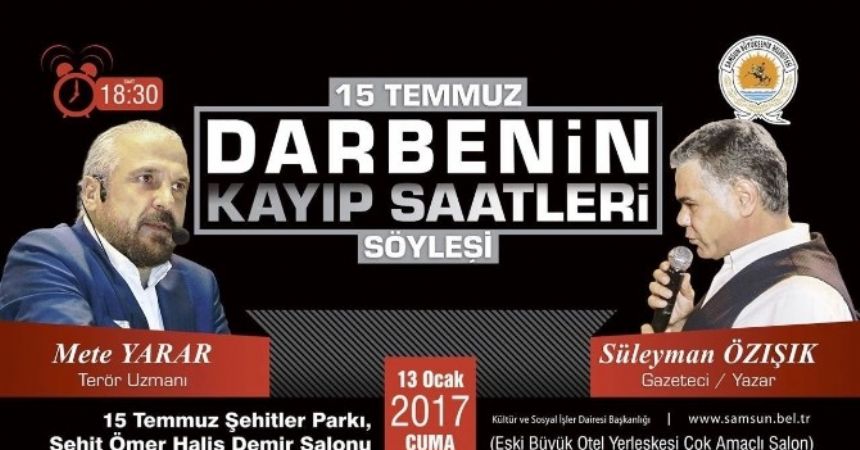 Güvenlik Uzmanı Mete Yarar ve Gazeteci-Yazar Süleyman Özışık, Samsun Büyükşehir Belediyesi’nin düzenlediği ’15 Temmuz Darbenin Bilinmeyen Saatleri’ konulu konferansla darbenin çarpıcı detaylarını Samsunlularla paylaşacak.