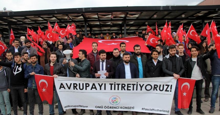 OMÜ Yaşam Merkezi önünde toplanan yüzlerce öğrenci, “Avrupa’yı Titretiyoruz” yazan pankart ve sloganlar eşliğinde Hollanda’ya tepki gösterdi. Grup adına basın açıklaması yapan OMÜ Öğrenci Konseyi Başkanı Muhsin Oğul, “Ülkemiz 16 Nisan’da tarihi bir süreçten geçecektir. Bu süreç sadece Türkiye’nin değil, ne yazık ki bir çok ülkenin tartışılan gündemi olmuştur. Geçtiğimiz günlerde Almanya, 2 gün önce ise Hollanda’nın bu fütursuzca tutumu milletimizi derinden üzmüştür. 1960 yılından beri vatandaşlarımız orada yaşamakta ve Hollanda’nın ekonomisine ve kültürel altyapısına katkı sağlamaktadır. Bunların tamamını göz ardı eden ve görmezden gelen bir ülke var artık karşımızda. Her platformda demokrasiden bahseden ancak demokratik söylem ve yaklaşımlara karşı olan, özgürlüğü haykıran ancak yasal biçimde ülkesinin bayrağını dalgalandırmaya çalışan vatandaşımızı engelleyen bir Avrupa görüyoruz. Bu ülke vatandaşlarımıza köpeklerle saldıran bir konuma gelmiştir. Vatandaşlarımızı ablukaya alıp onların üzerilerine atları süren ve medeniyetten bahsedip, bedeviliğin ötesine gitmeyi başaramayan bir zihniyet haline gelmiştir. Hollanda, Diplomatik pasaportu ile vatandaşla bir araya gelmek isteyen bakanımızı saatlerce bekleten utanç timsaline dönüşmüştür. Bunların temelinde faşizm ve nazizim yatmaktadır” dedi.