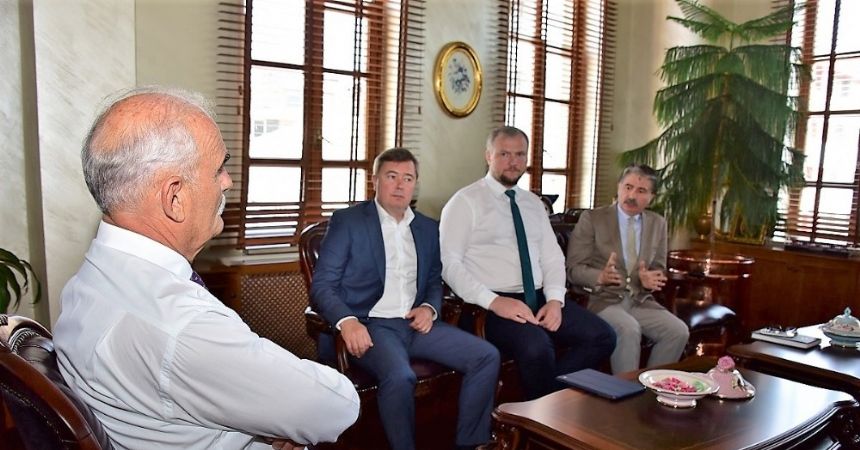 Başkanlık makamında gerçekleşen ziyarete Rus Line Havayolları şirketi yetkilileri Timofey Federov, Aleksey Donchenko ve Büyükşehir Belediyesi Kültür ve Sosyal İşler Daire Başkanı Necmi Çamaş katıldı.