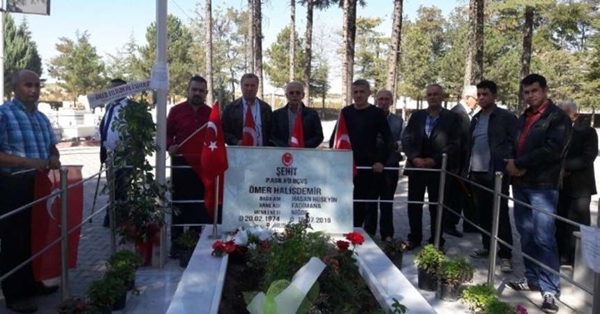 Niğde’nin Bor ilçesine bağlı Çukurkuyu beldesinde bulunan Şehit Astsubay Ömer Halisdemir’in kabrini ziyaret eden Samsunlu şehit yakını ve gaziler, Samsun’dan götürdükleri toprağı Şehit Ömer Halisdemir’in kabrine döktüler.