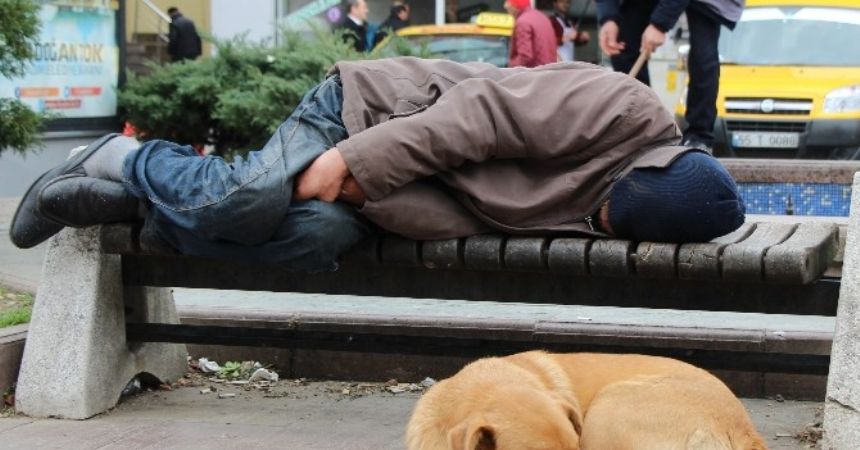 Saathane Meydanı’ndaki bankın üzerinde uyuyan ve kimsesiz olduğu belirtilen bir vatandaşa, sokak köpeğinin uyuyarak eşlik etmesi objektiflere yansıdı. İki kimsesizin yan yana uyuması hem ilginç hem de düşündüren bir fotoğraf ortaya çıkardı.