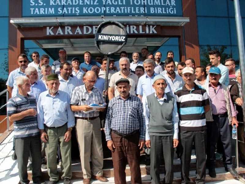 | Karadenizbirlik binası önünde toplanan çiftçiler, bu yıl yapılacak olan genel kurulda 400 çiftçinin usulsüz olarak saf dışı bırakıldığını iddia ederek, birlik önünde toplandı. Birlik kapısının girişine ‘Kınıyoruz’ yazılı siyah çelenk bırakan çiftçiler daha sonra basın açıklaması yaptılar. 400 çiftçi adına basın açıklamasını okuduğunu belirten Saffet Ergin, “Karadenizbirlik Genel Müdürlüğü’ne bağlı Havza ilçesinde faaliyet gösteren Yağlı Tohumlar Tarım Satış Kooperatifi’nin çiftçi üyeleriyiz. 2015 yılında yeterli miktarda ayçiçeğini kooperatifimize teslim ettik. Fakat ayçiçeği teslim etmemize rağmen 400 tane üye olarak rekolte fişlerinin üzerinde bizim imza attığımız evraklarda gerek daha sonra doldurularak gerek beyan hatasıyla bizleri bu yıl yapılacak olan genel kuruldan saf dışı etmişlerdir. Bizler Havzalı çiftçiler olarak haklarımızı hukuki ve yasal yönden aramak için gerekli girişimlerde bulunduk. Genel Müdürlüğümüzü bu konuda daha hassa davranmaya, iktidar ve muhalefet partilerinin temsilcilerinin konuyu yakından takip etmelerini ümit ediyoruz” dedi. Çiftçiler daha sonra siyah çelengi birliğe bırakarak, eylemlerini sonlandırdılar. Genel Müdür Erarslan: “Görsel şov yapmanın haricinde yasal yollar da var” Konu hakkında açıklamada bulunan Karadenizbirlik Genel Müdürü Ünal Erarslan, “Çiftçilerin şikayetleri hakkında bize yazılı olarak bir evrak ulaşmadı. Bize yazılı müracaatlar ulaştığında biz de yasal çerçeve içerisinde araştırıp, ilgili bakanlığa cevabını veririz. Böyle görsel olarak şov yapmanın haricinde bir de bu işin yasal yolları var. O yasal yollar takip edilir, konu da bize ulaşırsa ilgili araştırmayı yapar, cevabını da bakanlığımıza veririz” diye konuştu. |