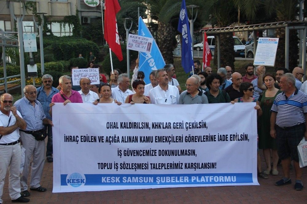 Uğur Mumcu Parkı’nda toplanan grup adına konuşma yapan KESK Dönem Sözcüsü Suat Yıldız, 1 Ağustos tarihinde toplu sözleşme sürecinin başladığını belirterek, “OHAL kaldırılmadan, KHK’lar geri çekilmeden, ihraç edilen kamu emekçileri görevlerine iade edilmeden yapılan toplu sözleşme görüşmelerini tanımıyor ve kabul etmiyoruz. En düşük maaş alan kamu emekçisinin maaşı 3.450 TL’ye çıkarılmalıdır” dedi.