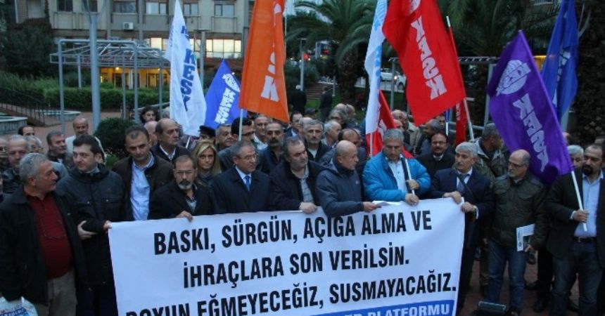 Uğur Mumcu Parkı’nda toplanan KESK Samsun Şubeler Platformu üyelerine CHP Samsun Milletvekili Kemal Zeybek de destek verdi. Grup adına basın açıklamasını okuyan KESK Samsun Şubeler Platformu Dönem Sözcüsü İsmail Yavuz, “29 Ekim gecesi çıkarılan KHK’larda binlerce kamu çalışanı ve KESK’e bağlı sendikaların üyeleri ihraç edilerek işinden atılmıştır. Bu uygulamaları kabul etmeyeceğiz. Gerekçe olmayan gerekçelerle, sendikal eylem ve etkinliklerimiz suçmuş gibi gösterilerek, idari kararlarla cezalandırılmıştır. Cumhuriyet gazetesine yapılan operasyon ile genel yayın yönetmeni, 18 yazar ve yöneticisi gözaltına alınmıştır. Sendikal eylem etkinliklerden dolayı ihraç ettiğiniz üyelerimizi işlerine iade ediniz. Ok yaydan çıkmıştır. Buradan herkesi parlamentoyu, siyasi partileri, sendikal konfederasyonları uyarıyoruz. Daha fazla izleyip, beklemeyeceğiz. KHK kesin kılıcının ne zaman bizim başımızı keseceğini beklemek için sıraya girmeyeceğiz. Haklarımız için, işimiz, ekmeğimiz için her türlü demokratik fiili mücadele meşrudur” dedi.