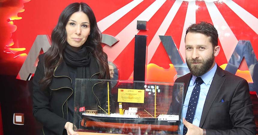 Ziyaretin sonunda ASİYAD Başkanı Osman Yılmaz, Çiğdem Karaaslan'a Bandırma Vapuru maketi hediye etti.