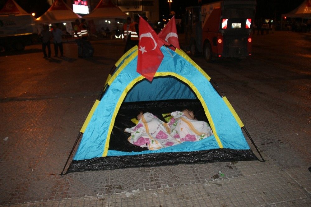 15 Temmuz darbe girişiminin 1. yıldönümü dolayısıyla Samsunlular Cumhuriyet Meydanı’nda nöbet tuttu. Meydanda uyuyan bazı vatandaşlar üstlerini Türk bayrağı ile kapatırken, çocuklar ise seyyar arabaların ve çadırların içerisinde uyudu.