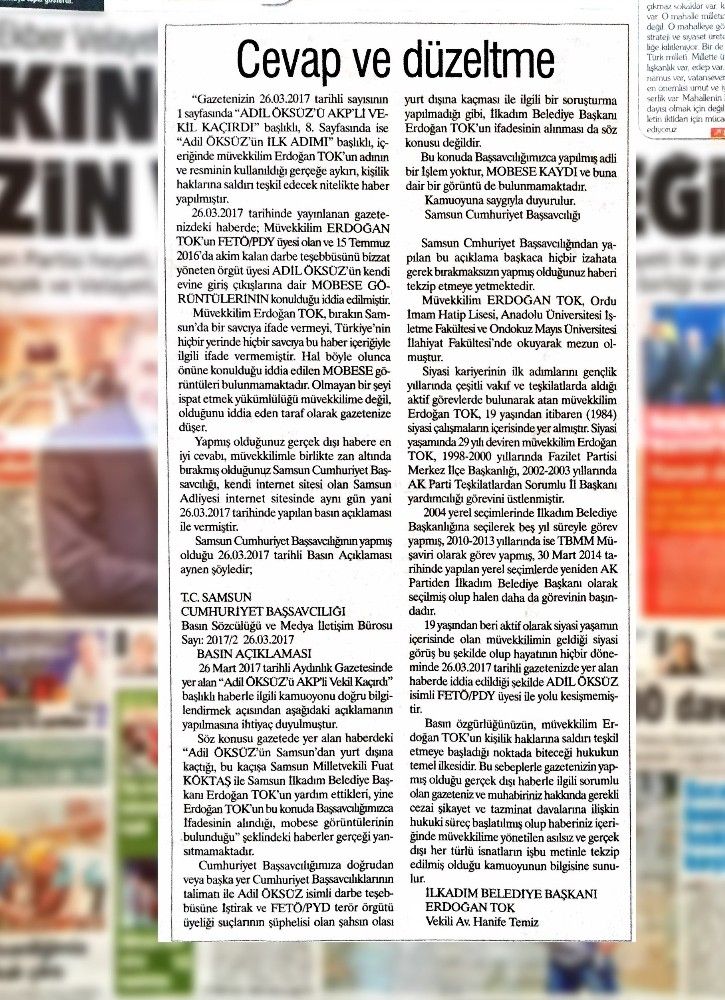 FETÖ’nün firari Hava Kuvvetleri İmamı Adil Öksüz’ün Samsun İlkadım Belediye Başkanı Erdoğan Tok’un evinde kaldığına yönelik haber yapan bir ulusal gazete tekzip yayınladı.