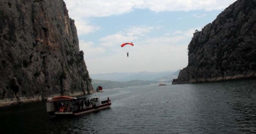 Samsun’un Vezirköprü ilçesinde bulunan Şahinkaya Kanyonu, adrenalin dolu bir gösteriye sahne oldu. Türkiye’nin ilk ve tek profesyonel base jumping sporcusu 35 yaşındaki Cengiz Koçak, doğa harikası kanyondan atlayış gerçekleştirdi. Samsun Büyükşehir Belediyesi tarafından desteklenen proje kapsamında 324 metre yüksekten serbest atlayış yapan Koçak, bu atlayışıyla birlikte 299 metreyle Erzurum Uzundere’deki atlayış rekorunu kırmış oldu.
