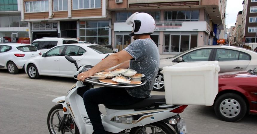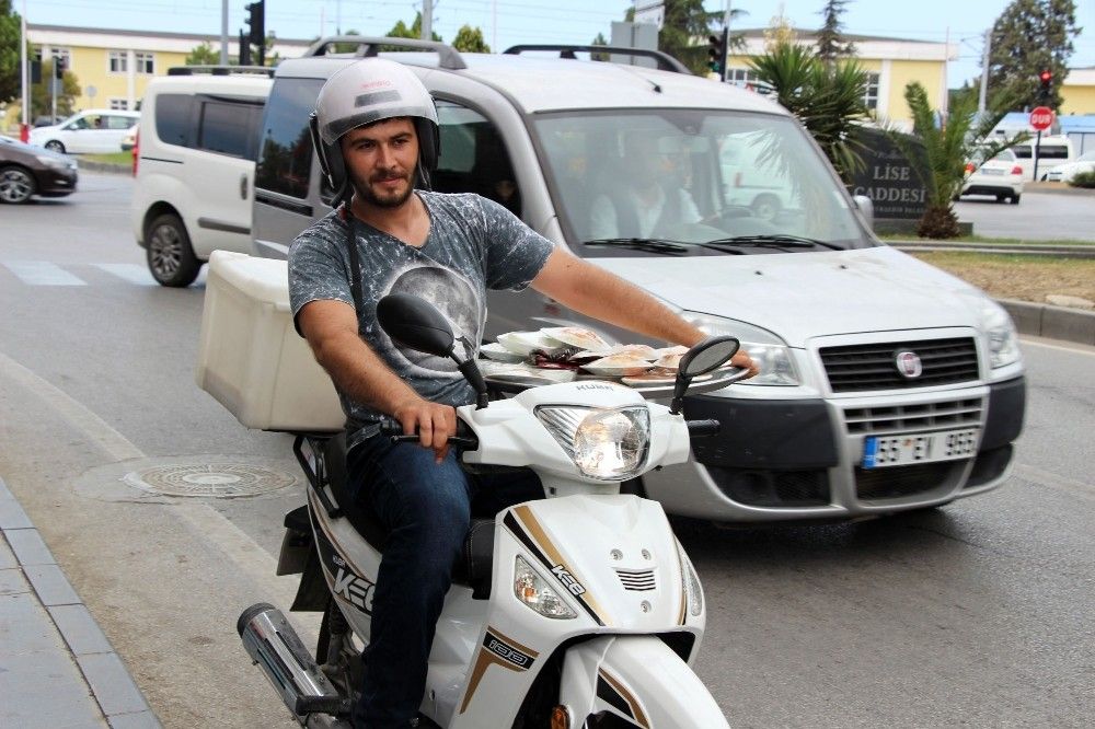 Samsun’da bir elinde yaklaşık 15 tabak yemeğin olduğu tepsiyi tutan, diğer eliyle de motosikleti süren kuryeyi trafikte görenler gözlerine inanamadı.