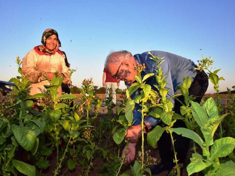 Samsun Büyükşehir Belediye Başkanı Yusuf Ziya Yılmaz, Bafra’dan dönerken tıpkı çocukluk yıllarındaki gibi tarlada tütün kırdı.