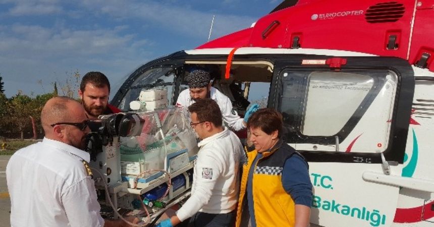 Ordu’da 30 haftalık hamileliğin ardından erken dünyaya gelen, kalp kapakçıklarında sorun ortaya çıkan 1 kilo ağırlığındaki 1 günlük kız bebek, özel bir hastanede tedavi altına alındı. Aynı zamanda solunum sıkıntısı çektiği için solunum cihazına bağlı olan bebek için sağlık ekipleri seferler oldu. Bebek için bölgede çocuk yoğun bakım hastanelerinde yer arandı ve Samsun’dan haber geldi. Bebeğin tedavisini Samsun’da bulunan özel bir hastane kabul edince zaman kaybetmemek için adeta dakikalarla yarışıldı. Bebeğin Samsun’a sevki için ambulans helikopter talep edildi. Samsun’dan kalkan Sağlık Bakanlığına bağlı 112 Acil Servise ait ambulans helikopter, Ordu’ya giderek 1 günlük bebeği alıp Samsun’daki özel bir hastaneye nakletti. Kuvöz içinde solunum cihazına bağlı bebek, helikopterden indirilip daha sonra kara ambulansıyla özel hastaneye götürüldü.