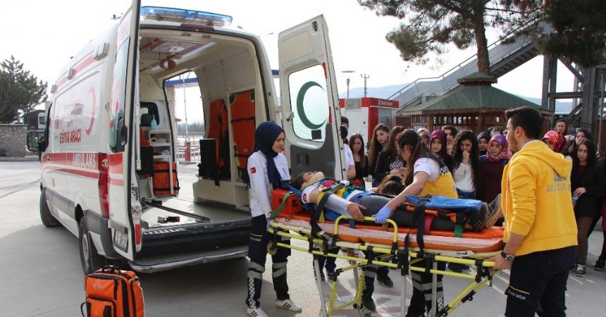 Öğrenciler yeni ambulansla tatbikat düzenlerken, Sabuncuoğlu Şerefeddin Sağlık Hizmetleri Meslek Yüksekokulu Müdürü Yrd. Doç. Dr. Arif Ayar da ambulansın öğrencilerin pratik yapma imkanı bulacaklarını söyledi.