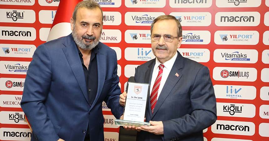 Samsun Büyükşehir Belediye Başkanı olarak 31 Mart tarihinde görevi devredecek olan Zihni Şahin’e Samsunspor'a katkı ve desteklerinden dolayı Başkan İsmail Uyanık tarafından plaket verildi