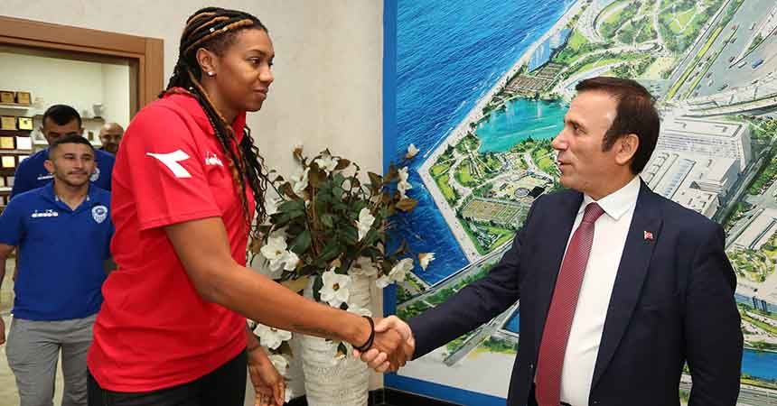Samsun'u Türkiye Kadınlar Basketbol Süper Ligi'nde başarıyla temsil eden Samsun Canik Bayan Basketbol Takımı Antrenörü Ekin Baş, takım oyuncuları ve kulüp yöneticileri Canik Belediye Başkanı Osman Genç'i makamında ziyaret etti. Samimi bir ortamda gerçekleşen ziyarette oyuncularla tanışan Başkan Genç, Samsun Canik Bayan Basketbol Takımı'nın şehrin tanıtımına katkıda bulunduğuna dikkat çekerken, takım oyuncuları yeni sezon öncesi başarı sözü verdi.