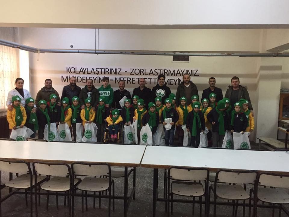 Akın Çorap Giresunspor’un taraftar grubu ‘Genç Çotanaklar Kumyalı’ üyeleri ‘Çocuklar üşümesin, Giresunsporlu yetişsin’ sosyal sorumluluk projesi kapsamında Bulancak ilçesi Kovanlık Beldesinde bir ilkokulda ihtiyaç sahibi öğrencilere mont ve Giresunspor ürünlerinden oluşan yeni yıl hediye paketlerini ulaştırdılar.