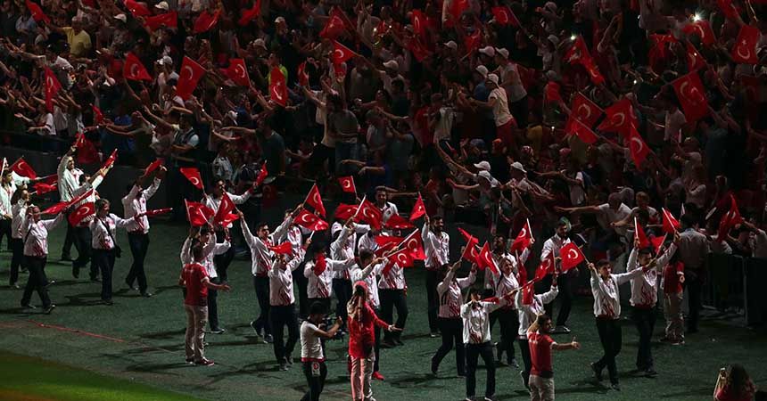 Açılış seremonisine ev sahipliği yapan yeni 19 Mayıs Stadyumu’nun tribünleri de sahanın içi gibi dünya bayraklarının renklerine büründü. Ev sahibi Türkiye’nin bayrakları çoğunlukta olsa da, 97 ülkenin katılımıyla düzenlenen organizasyona katılan altı kıtadan ülkelerin bayrakları tribünlerde bir renk cümbüşüne dönüştü.