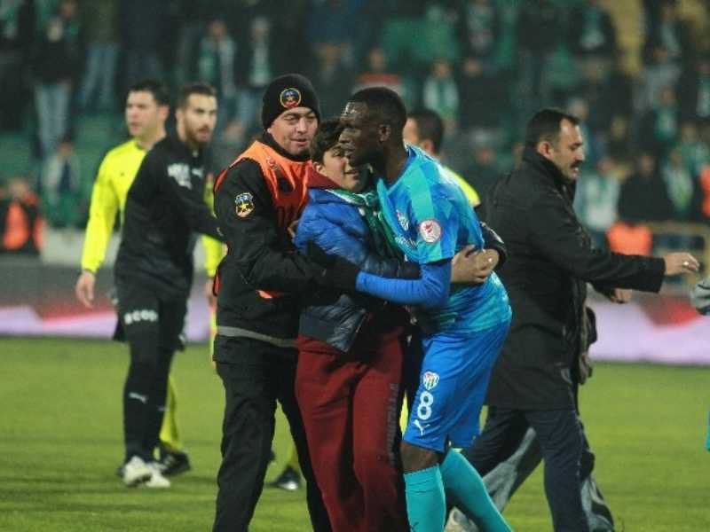 Bursasporlu küçük taraftarlar, Bursaspor’un Eskişehirspor karşısında aldığı 4-1’lik galibiyetin ardından sahaya atlayıp Bakaya Traore’ye sarıldı.