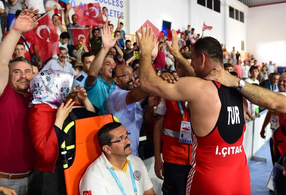 23. Yaz İşitme Engelliler Olimpiyat Oyunları’nda grekoromen güreş branşında mücadele eden İlhan Çıtak 98 kiloda, Muhammed Akdeniz 71 kiloda ve Mehmet Ali Yiğit 59 kiloda altın madalya kazandı. Milli güreşçiler minderde madalya mücadelesi verirken, aileleri de tribünlerden büyük bir heyecanla oğullarını izledi.