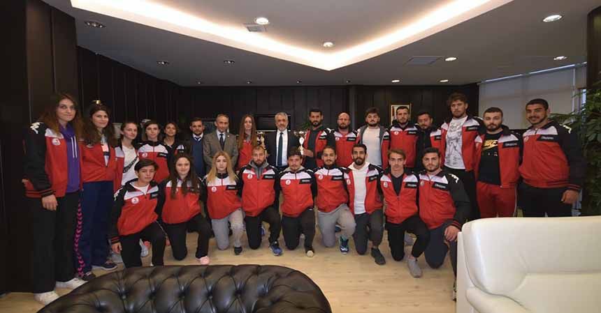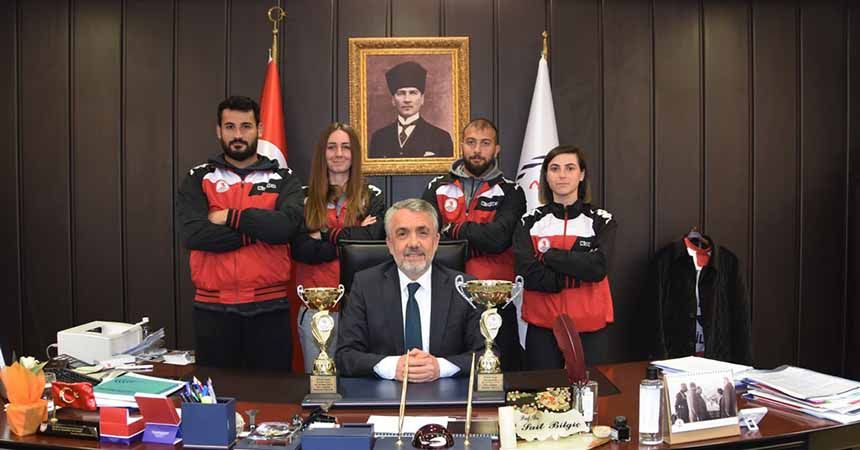 Belek Limak Arcadia Golf Sport Resort Otel'de gerçekleştirilen Ragbi Ünilig Türkiye Şampiyonası'nda tüm maçlarını kazanarak şampiyonluk kupasını kaldıran Erkek Ragbi Takımı ile Türkiye üçüncülüğüne uzanan Kadın Ragbi Takımı, elde ettikleri kupaları Rektör Bilgiç’e takdim ettiler.