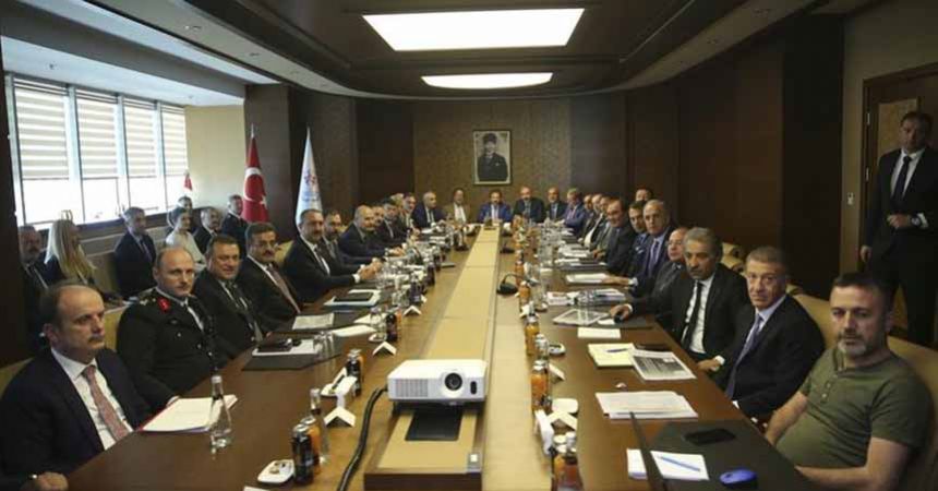 Gençlik ve Spor Bakanlığı Merkez Binası'nda yapılan toplantıya; Gençlik ve Spor Bakanı Dr. Mehmet Kasapoğlu, Adalet Bakanı Abdülhamit Gül, İçişleri Bakanı Süleyman Soylu, Türkiye Futbol Federasyonu (TFF) Başkanı Yıldırım Demirören, Türkiye Basketbol Federasyonu (TBF) Başkanı Hidayet Türkoğlu, Türkiye Voleybol Federasyonu (TVF) Başkanı Mehmet Akif Üstündağ, Türkiye Hentbol Federasyonu Başkanı Bilal Eyüpoğlu ve 18 Süper Lig kulübünün temsilcileri katıldı.