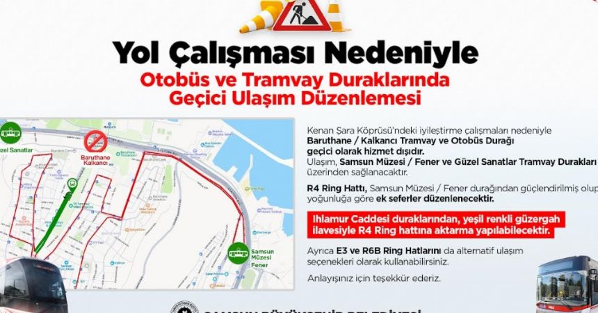 Geçici düzenleme süresince vatandaşların mağduriyet yaşamaması adına ulaşım hizmetleri Samsun Müzesi / Fener ve Güzel Sanatlar Tramvay Durakları üzerinden sağlanacak. Bölgedeki yolcu yoğunluğu ve şantiye alanının güvenliği dikkate alınarak Samsun Müzesi / Fener Tramvay Durağı’ndan hareket eden R4 Ring Hattı güçlendirildi. Mevcut seferlere ek olarak, ihtiyaç duyulması halinde yolcu yoğunluğuna bağlı olarak ilave ring seferleri de devreye alınacak.